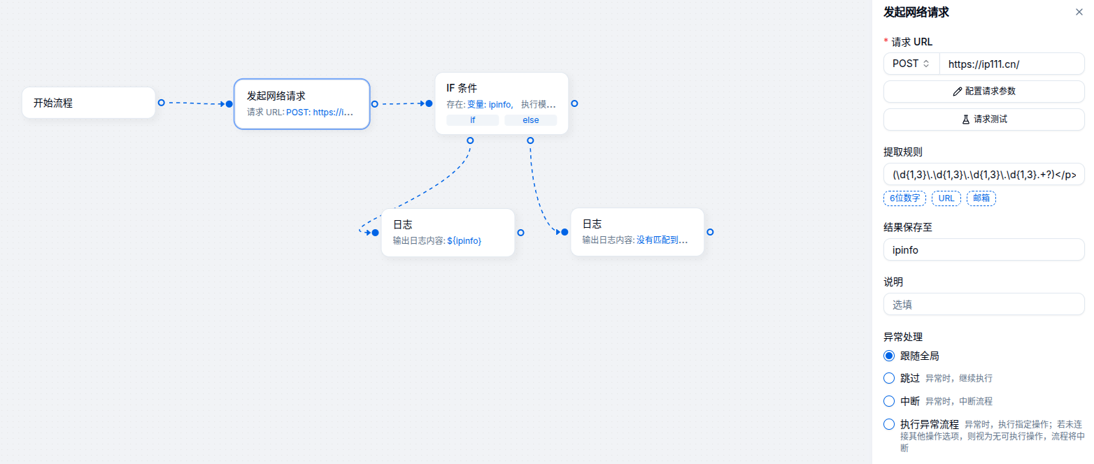 在编辑RPA流程中,有时会自己开发web api提供出灵活的动态参数,或者是需要网络请求获取特定的数据,下面是一个最简单的网络请求匹配内容的例子