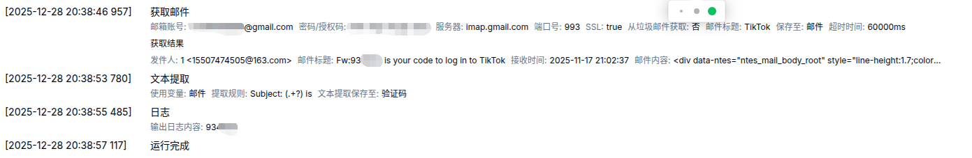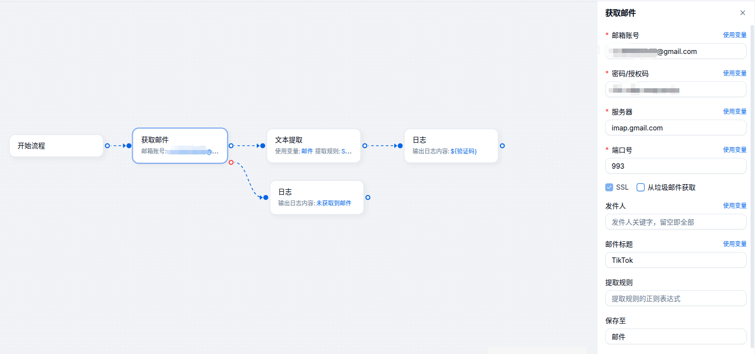 在获取数据中的获取邮件,填上对应的参数即可,匹配时如果不填写任何过滤条件,则默认匹配最新的一封邮件。提取规则可以在获取邮件时匹配,也可以邮件保存为变量,再通过文本提取进行匹配