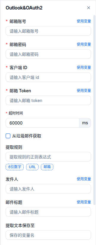 必填项为OAuth2登陆使用的参数,可以根据正则匹配邮件的内容。根据发件人信息,或者邮件标题获取目标邮件。最后的邮件内容可以保存至变量,在其他地方使用。