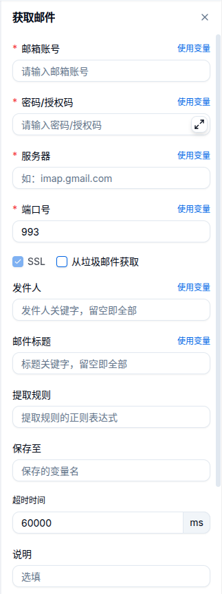 设置邮箱登陆的参数,根据设置的发件人信息和邮件标题过滤指定邮件,根据提取规则对邮件内容进行匹配,最后结果可以保存到变量