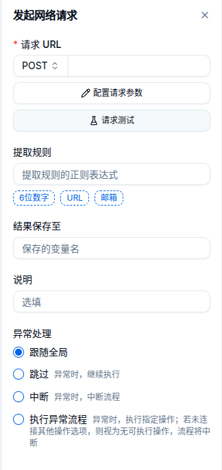 在配置请求参数中,可以设置请求头信息。请求测试可以立即发送网络请求进行验证。请求的结果可以通过提取规则匹配后保存至变量中使用