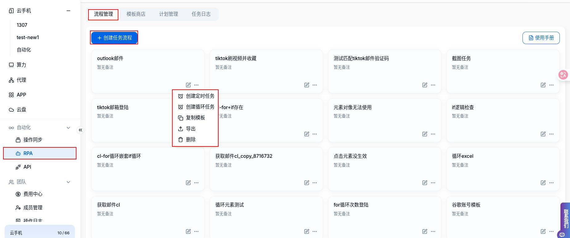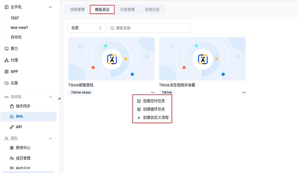 云手机中的RPA中主要包含四个基础功能,分别为流程管理、模板商店、计划管理、任务日志。 下面对每个基础功能逐个介绍。