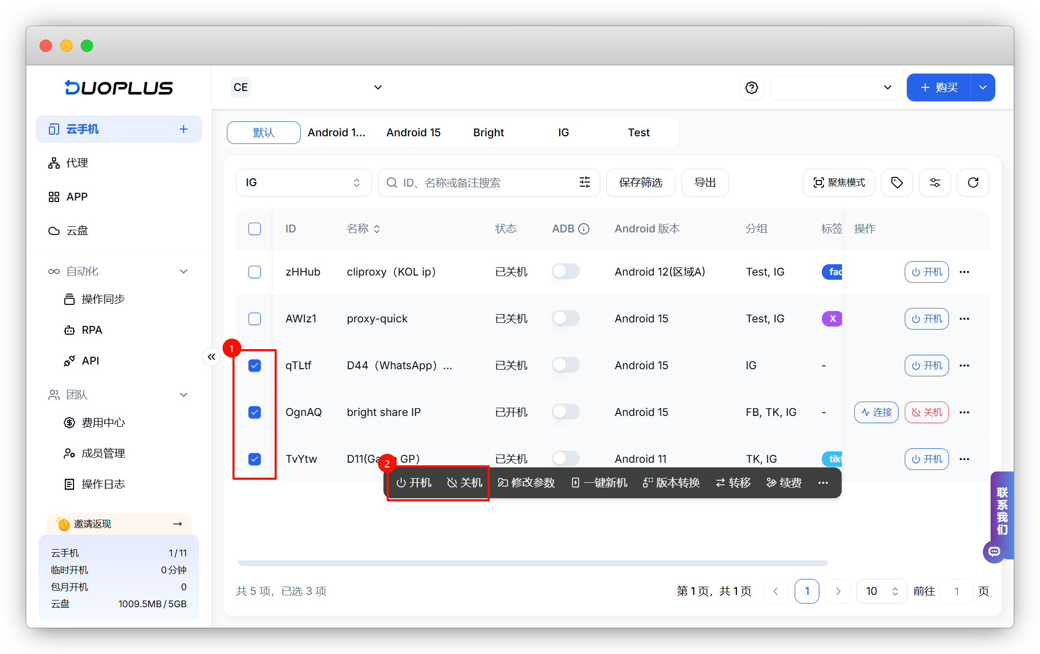 您还可以很方便地对列表内的云手机批量执行开机和关机操作