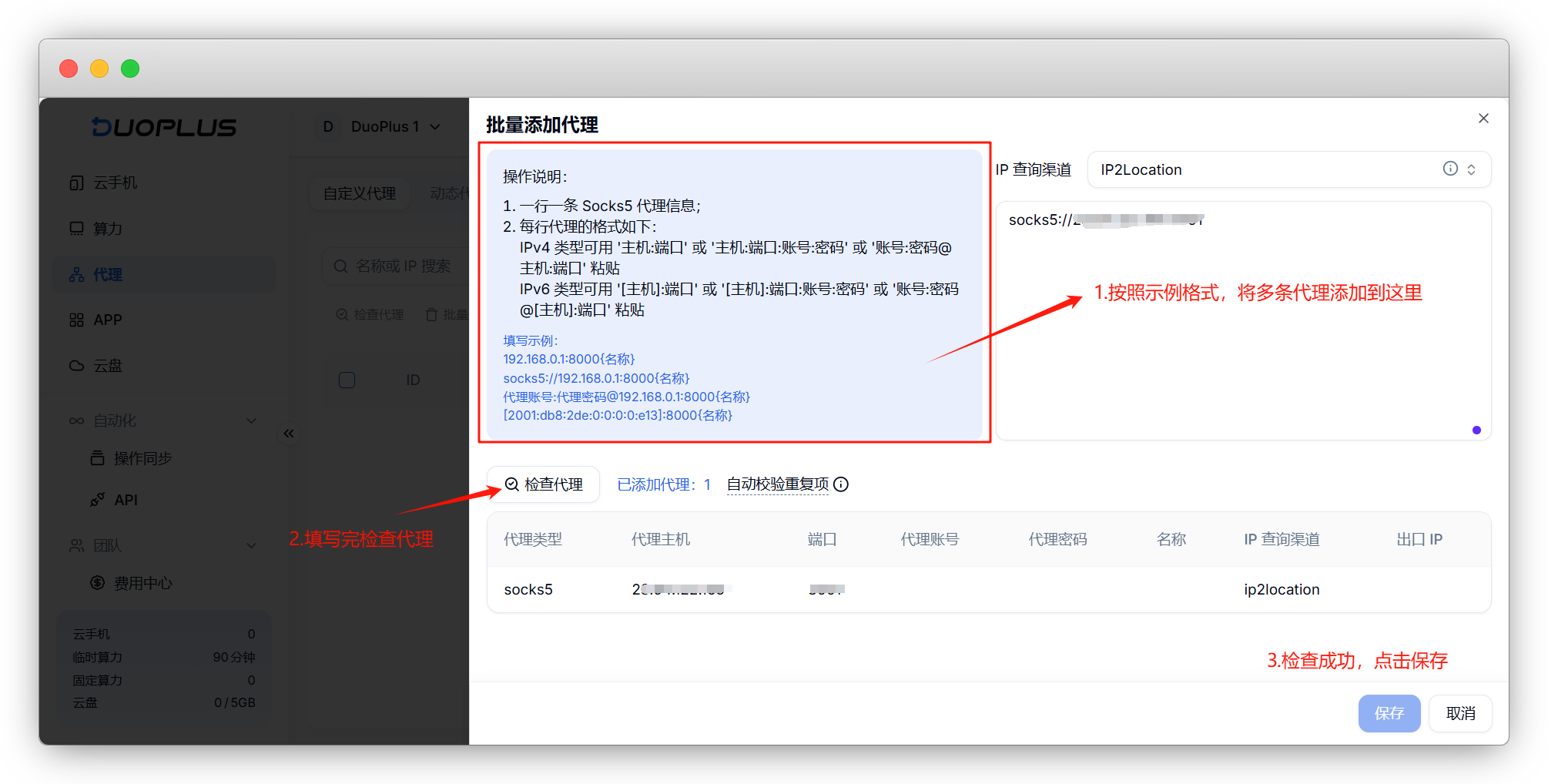 按照左侧示例格式,将多条代理填写至右侧框内,填写完成后检查代理,下方框内会显示代理添加情况,成功即可保存