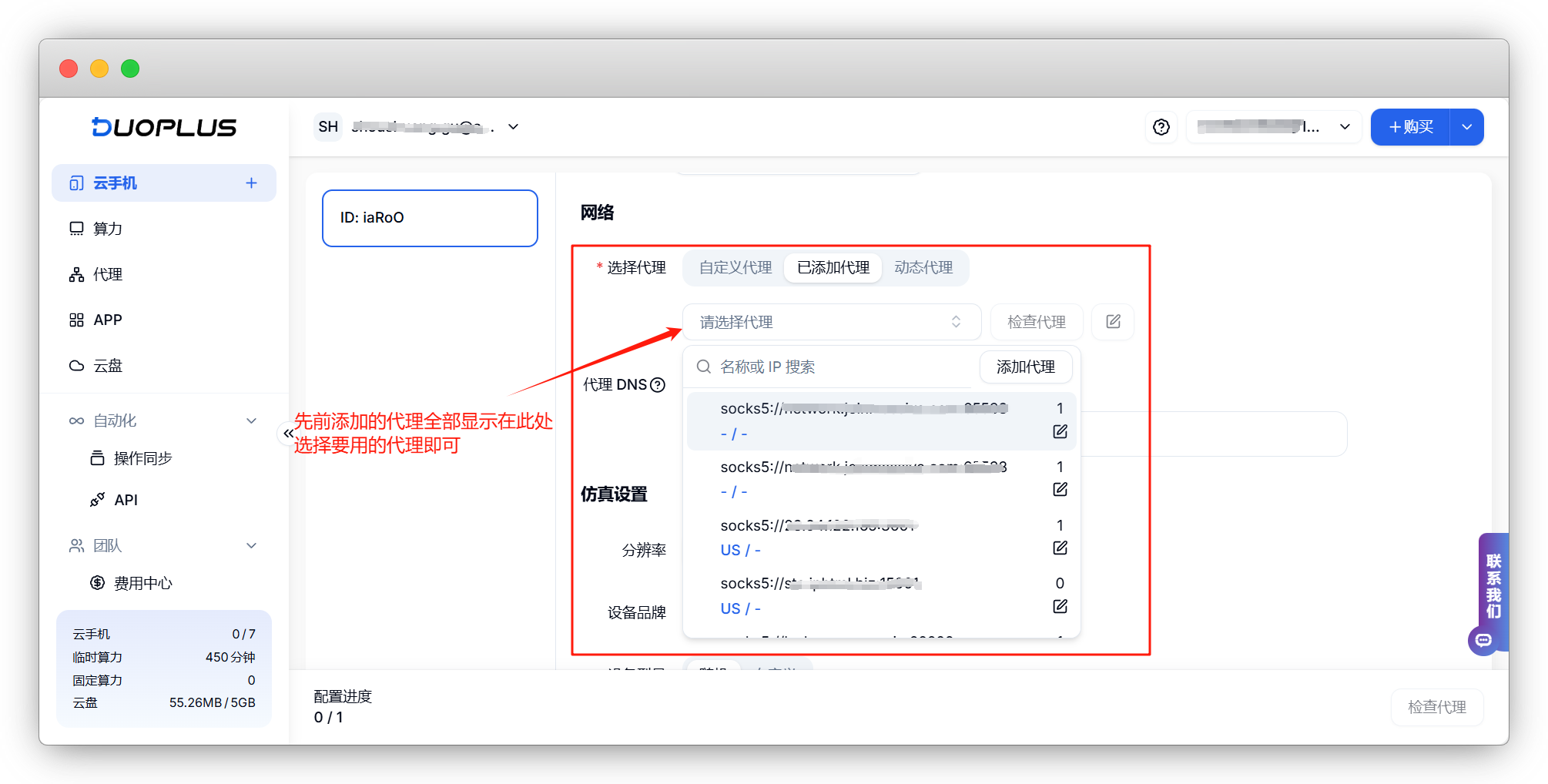 之前添加的代理全部显示在栏内,选择要用的代理,完成配置即可正常使用云手机