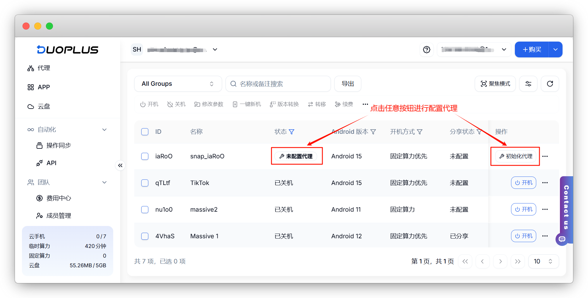 云手机购买完后会自动跳入到代理配置界面,或者在云手机界面选择【配置代理】