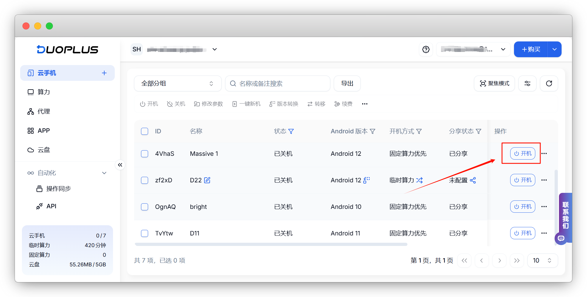 IP配置成功后,返回云手机管理界面,点击开机即可