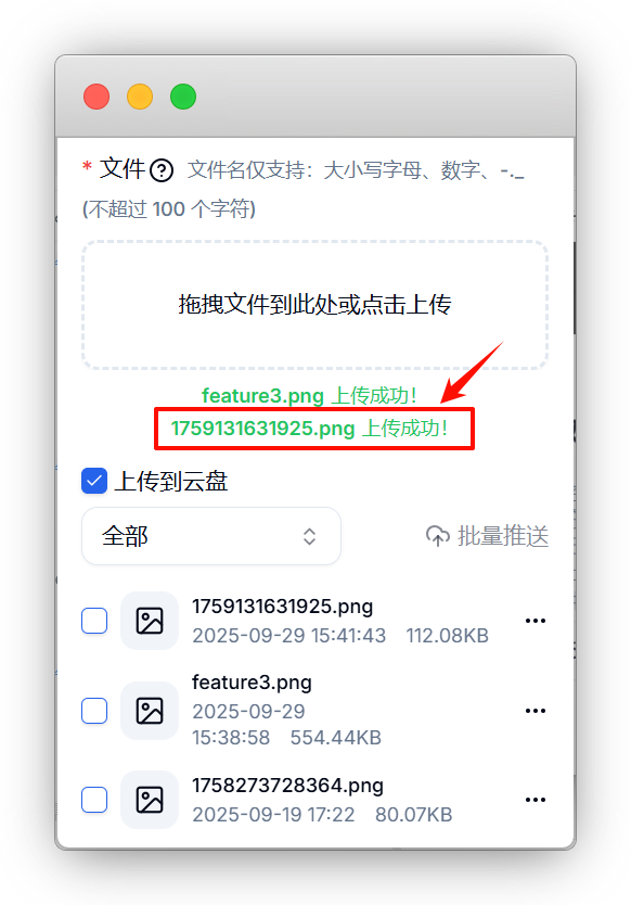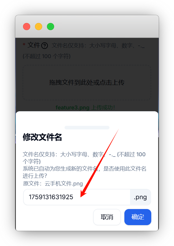 如果您上传的文件名不符合要求,系统会自动修改文件名,您可以在这里手动对自动生成的文件名进行修改