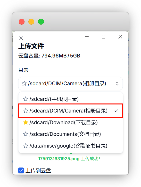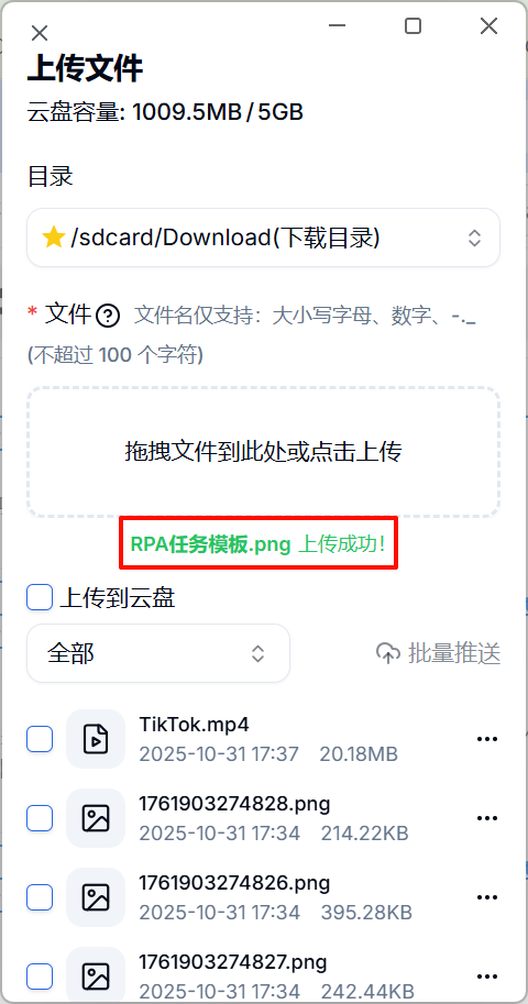 注意:如果您上传的文件较大,可能需要等待30秒-1分钟左右才能在云手机内查看到