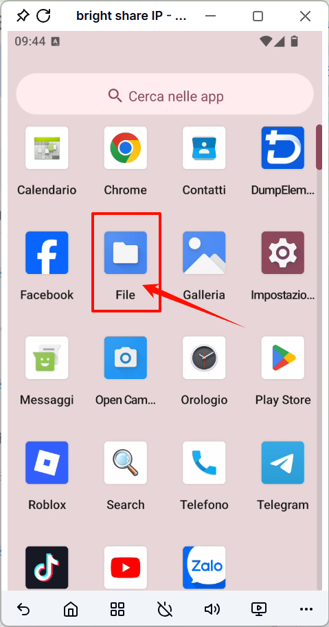 在云手机桌面内按住鼠标左键同时上滑,调出搜索应用页面,选择File应用