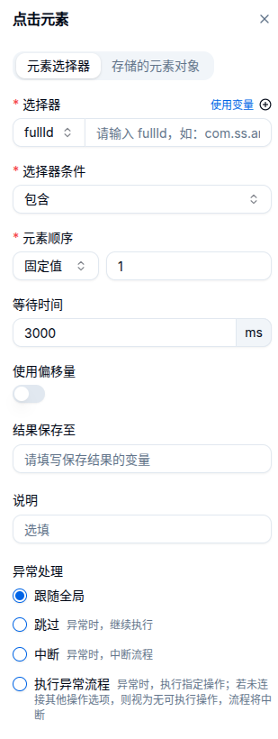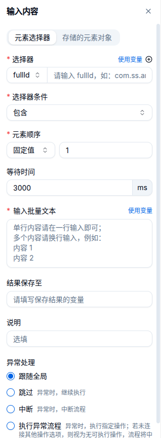 通过选择器类型和条件获取到输入框,可使用变量作为输入内容,输入的内容也可以保存为新的变量