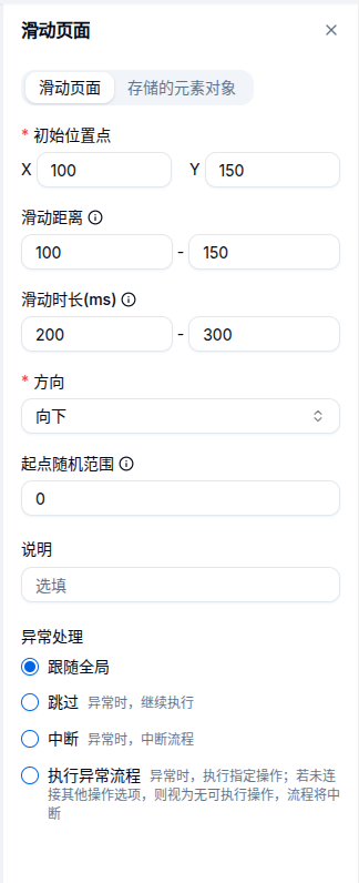可以设置滑动的开始位置,滑动的长度范围,滑动的耗时,以及滑动的方向