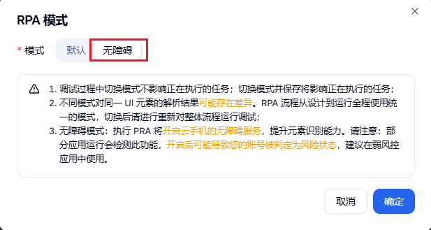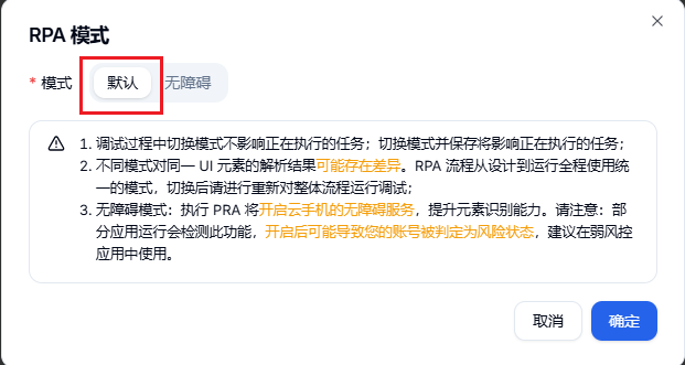 可以选择默认和无障碍两种模式获取元素,点击确定使用当前选择的模式